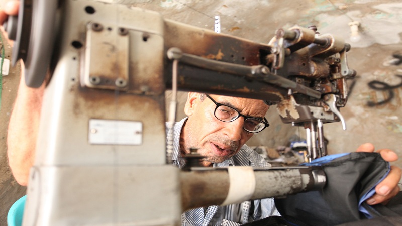 تجاعيد وجهه وندوب الزمن التي تحتل جزءًا كبيرًا من ملامحه، تقص وتروي حكاية هذا الشعب الأبي، حيث اعتاد المارة على وجوده في تلك الحجرة الصغيرة التي يتخذ منها ورشة له منذ 40 عامًا كاملة، يقضي بها نهاره كاملاً، مستقبلاً الحقائب والأحذية لإصلاحها على مدار سنوات عديدة تعاقبت عليه خلالها الأجيال، فزبائن اليوم هم أبناء وأحفاد زبائنه القدامى، تمضي السنوات وتتتابع الأجيال بينما لا يزال هو باقيًا في ورشته، متخذًا نفس الجلسة خلف ماكينة الخياطة كأنما يقف شاهد عيانٍ على التاريخ.
