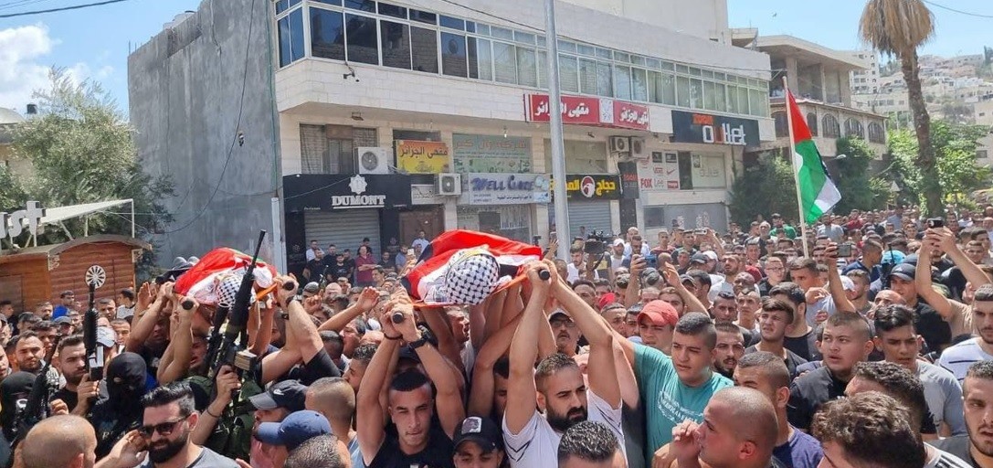 متابعات: شيّعت جماهير حاشدة في مخيم جنين، ظهر اليوم جثمانيّ الشهيدين صالح عمار ورائد أبو سيف الذين ارتقيا عقب اقتحام قوات الاحتلال للمخيم فجر اليوم.