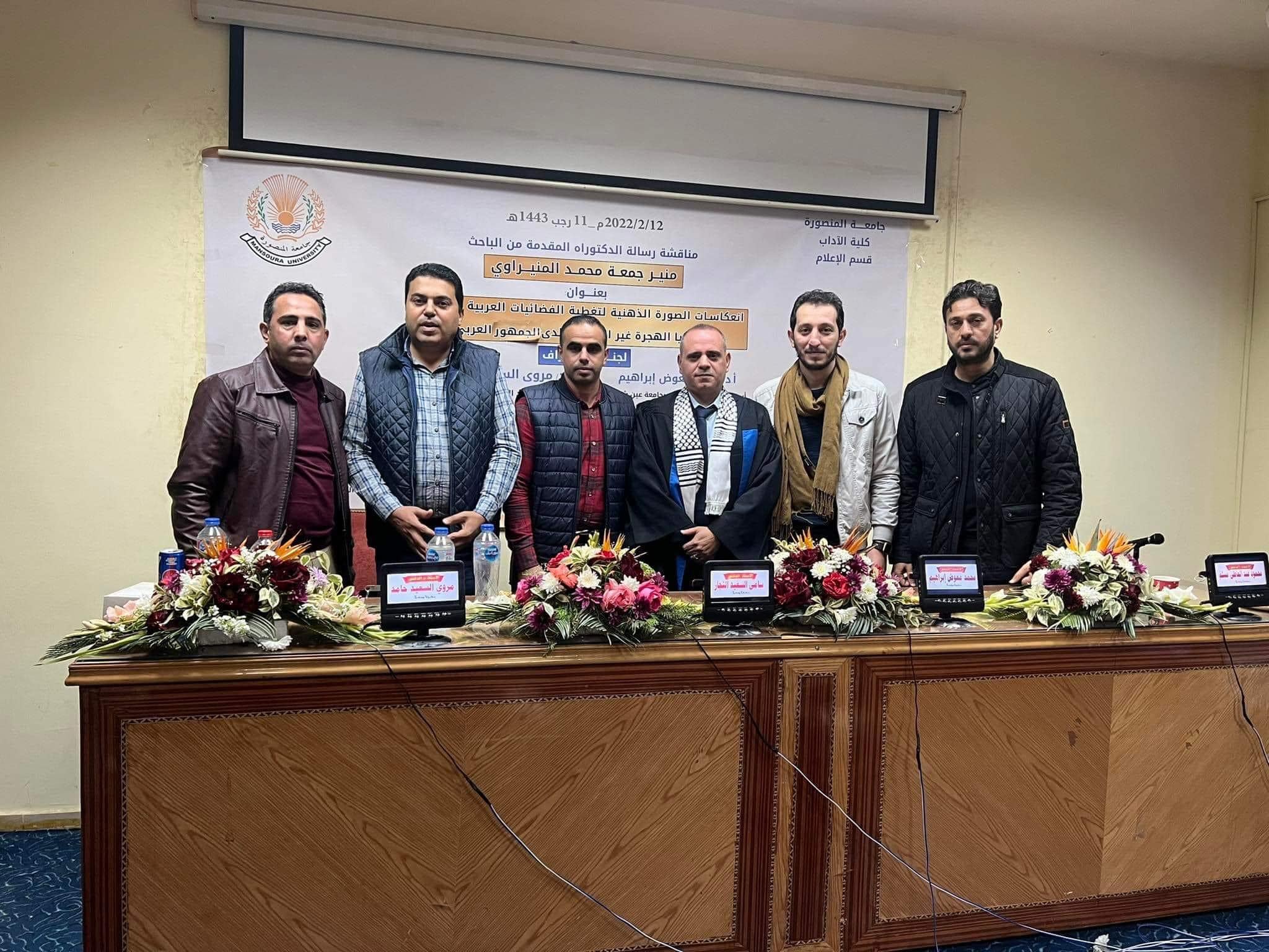خاص: حصل الزميل منير جمعة المنيراوي، القائم بأعمال مدير عام قناة الكوفية، اليوم السبت، على درجة الدكتوراه، من كلية الآداب بجامعة المنصورة، في شمال مصر، حول «انعكاسات الصورة الذهنية لتغطية الفضائيات العربية والأجنبية لقضايا الهجرة غير الشرعية لدى الجمهور العربي».