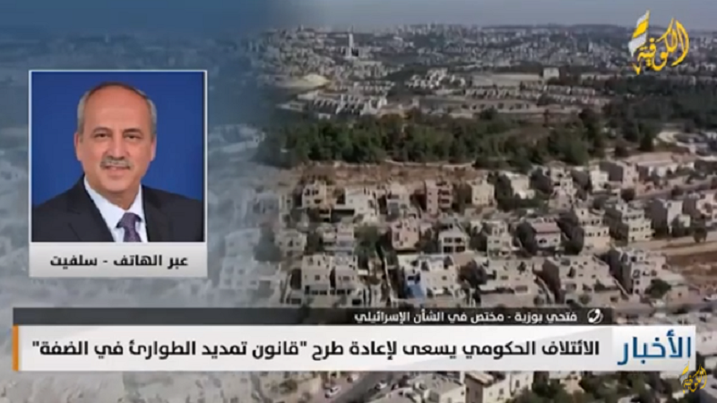 وأوضح خلال لقائه على قناة «الكوفية»، أمس الأربعاء، أن الائتلاف في حكومة الاحتلال يسعى إلى إعادة طرح تمديد قانون الطوارئ في الضفة الفلسطينية.