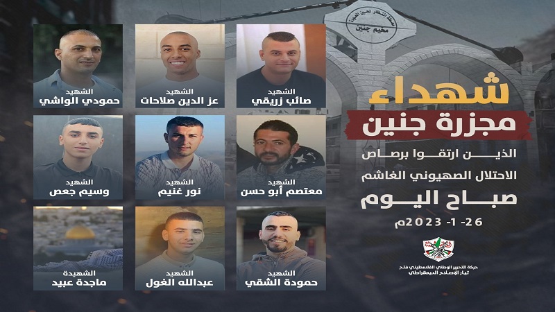 شهداء مخيم جنين الذين ارتقوا برصاص قوات الاحتلال صباح اليوم: نور غنيم، معتصم أبو الحسن، حمودي الواشي، عبد الله الغول، حمودي الشقي، صائب ازريقي، محمد غنيم برقين ، الشهيدة أم زياد ،عز الدين صلاحات