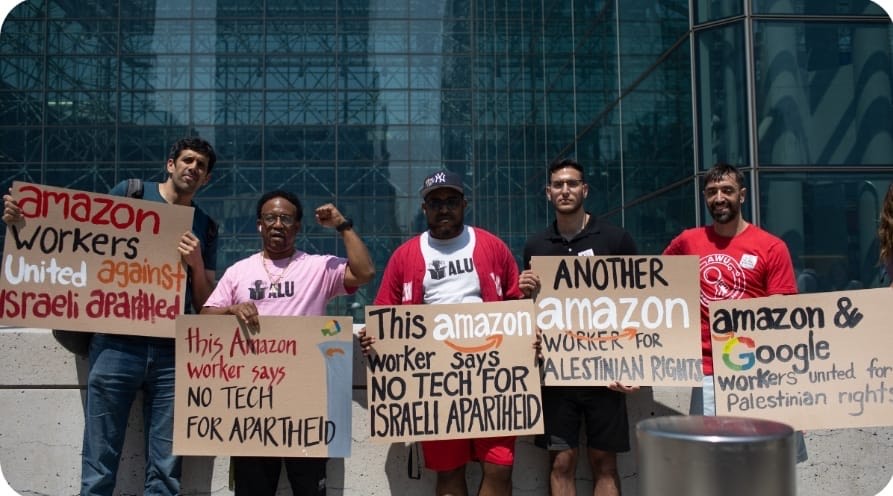 وطالب العشرات من أنصار الحق الفلسطيني، خلال الوقفة، مساهمي شركة "أمازون" بالتدخل لدى إدارة الشركة لدفعها لاتخاذ قرار بالانسحاب من عقد وقعته بالشراكة مع شركة "غوغل" مع وزارة الحرب في حكومة الاحتلال، يشمل نقل قاعدة بيانات الجيش للتكنولوجيا السحابية واستخدام أنظمة متطورة لمراقبة أبناء الشعب الفلسطيني وتنفيذ جرائم بحقهم.