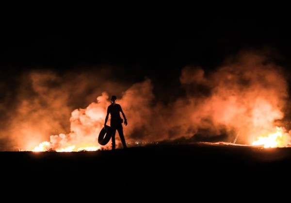 غزة/ أشعل شبان من مخيم البريج وسط قطاع غزة، الإطارات المطاطية شرقي المخيم قرب السياج الفاصل.