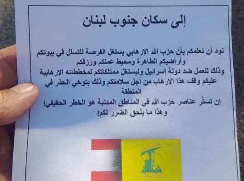 منشورات غامضة تسقط جنوب لبنان وتحذر السكان من حزب الله