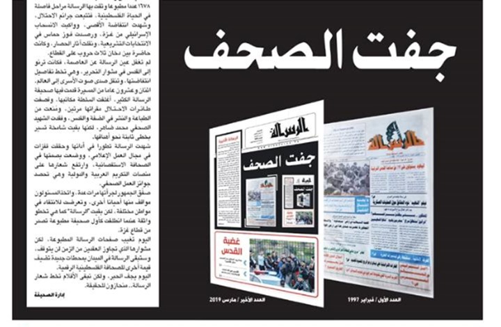 وقالت الصحيفة في بيان صحفي إنه "بعد 22 عاما توقف إدارة مؤسسة الرسالة للإعلام النسخة المطبوعة لصحيفة الرسالة، لتعلن رحيل الورق وبقاء الرسالة"، مشيرة إلى أنها "في شباط/ فبراير 1997 انطلقت بعددها الأول، وفي آذار/ مارس 2019 تجبر الأزمة المالية الصحفية على وقف الطباعة".