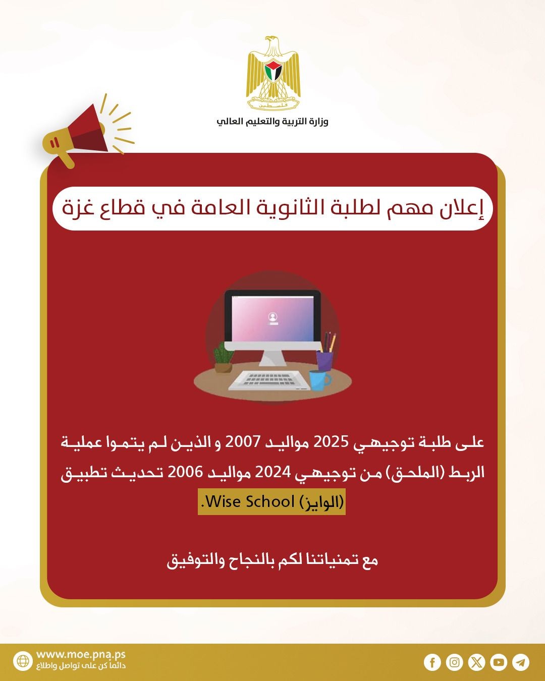 الكوفية متابعات: أصدرت وزارة التربية والتعليم ، اليوم الأربعاء ،علاناً مهماً لطلبة الثانوية العامة " التوجيهي " في قطاع غزة .