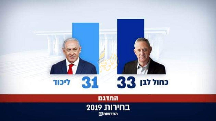 وحسب الاستطلاع الأولي للنتائج، فإن تحالف "أزرق أبيض" بقيادة رئيس الأركان الأسبق، بيني غانتس، حصل على 33 مقعدا من أصل 120، مقابل 32 لحزب "الليكود" الذي يقوده نتنياهو.