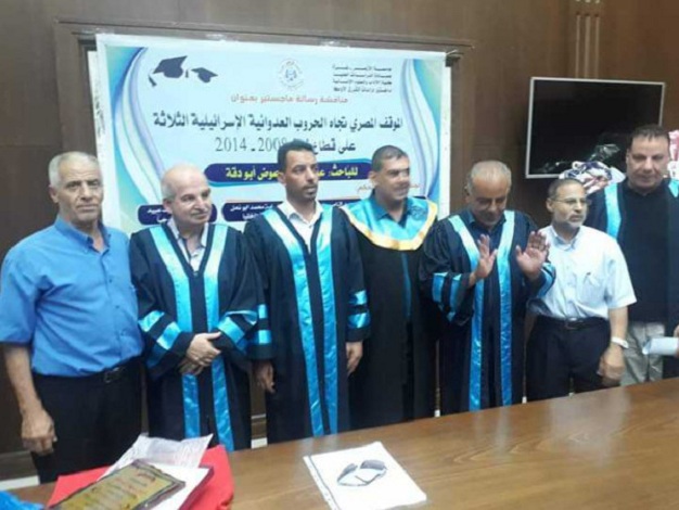 غزة: منحت جامعة الأزهر، اليوم الثلاثاء، الإعلامي عوض نبهان أبو دقة، درجة الماجستير في دراسات الشرق الأوسط، مع التوصية بنشر وطباعة رسالته الموسومة بـ"الموقف المصري تجاه الحروب العدوانية الإسرائيلية الثلاثة على قطاع غزة (2008-2014)"، وسط حضور لافت من النخب السياسية والأكاديمية والإعلامية والشخصيات الاعتبارية