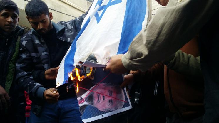 وحرق المشاركون في المسيرة الأعلام الإسرائيلية وصور الرئيس الأمريكي دونالد ترامب.