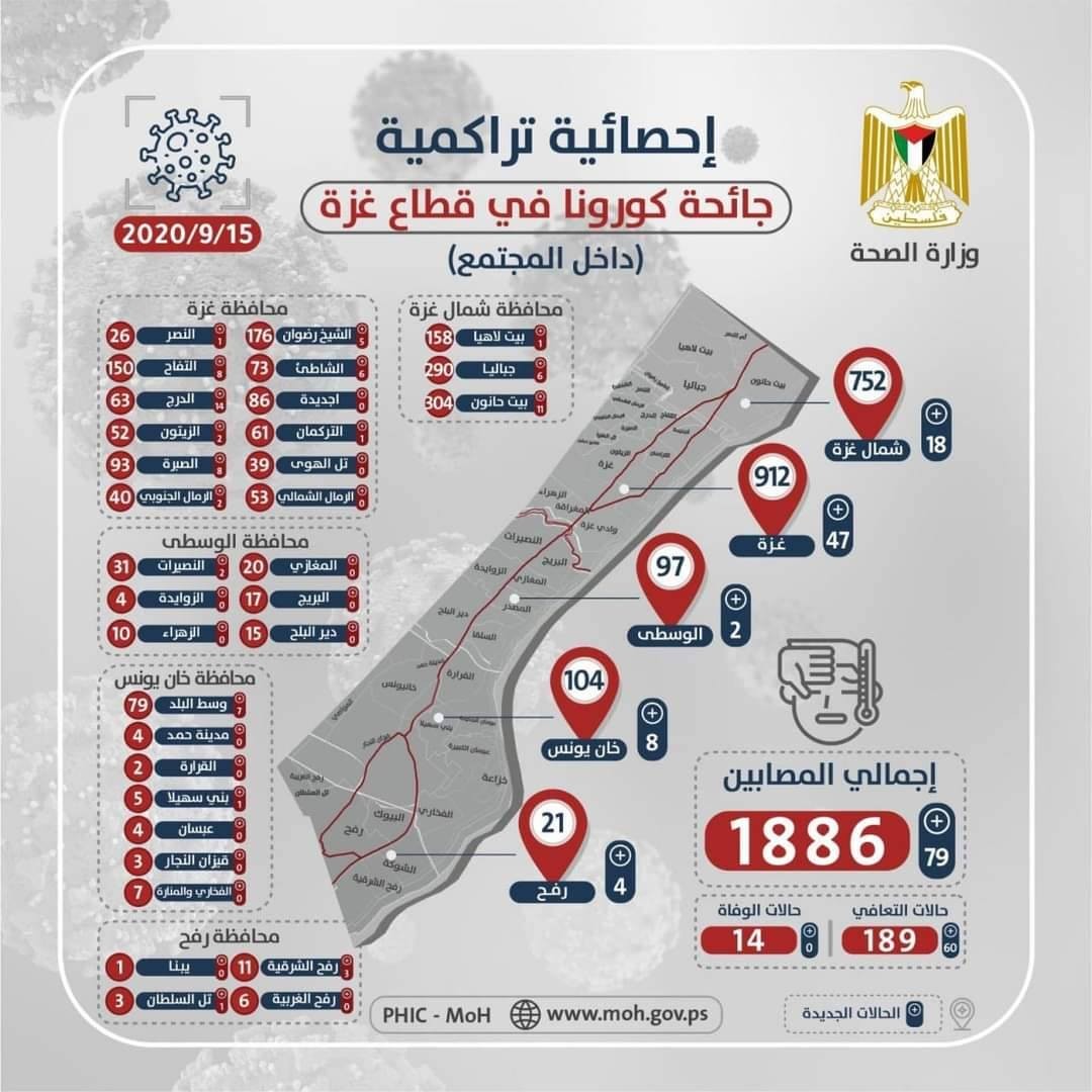 وبينت الصحة في الإحصائية التراكمية حول جائحة كورونا، أن "إجمالي الإصابات 1886، منها 752 شمال القطاع، 921 في غزة، 97 في الوسطى، 104 في خانيونس، 21 في رفح".