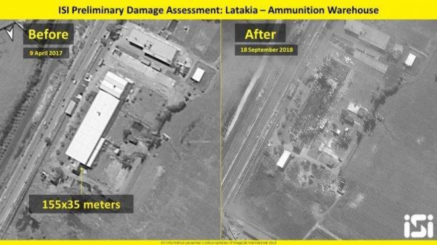 القدس المحتلة: نشرت شركة "إيميج سات" التجارية، صورًا التقطت من قمر صناعي، أظهرت دمارا كاملا فيما تسميه "إسرائيل" مخزنًا للأسلحة استهدفته مؤخرًا طائراتها في الهجوم على اللاذقية.