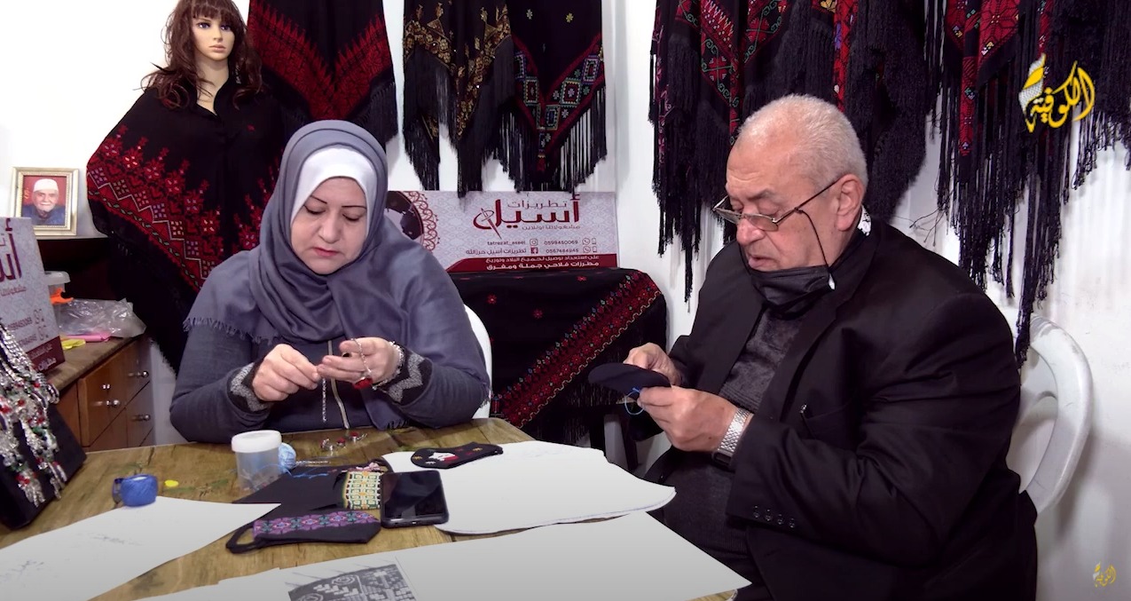 "أبو رامي وأم رامي" زوجان مسنان يعملان في مشروعهما الخاص "مطرزات أسيل"، إذ يقومان بتجهيز قطع من المطرزات التراثية بشكل فني ومحترف بطريقتها الخاصة، لبيعها للزبائن بأحجام وأشكال مختلفة.